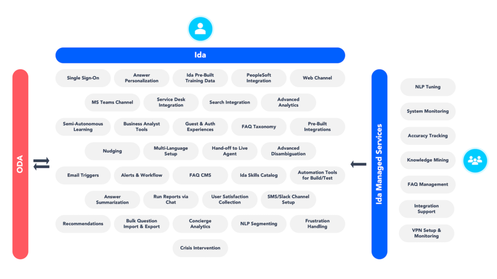 Many years ago our digital assistant, Ida, shifted to using Oracle’s ODA PaaS service for its natural language processing (NLP) due to its flexibility and power. ODA is often unheralded, but its NLP uses 40 years’ worth of enterprise data from “The” data company, Oracle. It is a unique advantage not held by competing products.